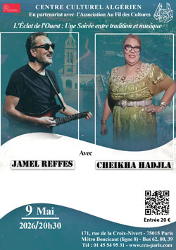 Cheikha HADJLA et Jamel REFFES nous promettent une soirée exceptionnelle. La belle scène du CCA-Paris vibrera, en effet, au rythme de deux signatures musicales incontournables.