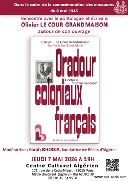 Rencontre avec le politologue et écrivain Olivier LE COUR GRANMAISON autour de son ouvrage "Oradour coloniaux français" - Jeudi 7 mai 2026 à 19h