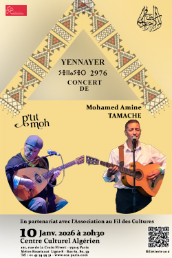 A l’occasion du Nouvel an amazigh, le Centre culturel Algérien vous invite à célébrer Yennayer 2976 à travers un voyage musical au cœur des rythmes amazighs et chaâbi avec P'tit Moh et Mohamed Amine TAMACHE.