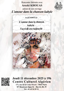 "Rencontre littéraire avec l’écrivain et universitaire Arezki KHOUAS autour de son ouvrage L’amour dans la chanson kabyle – Tayri di cna taqbaylit " - Jeudi 11 décembre 2025 à 19h