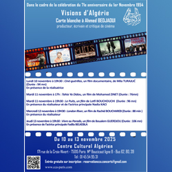 Dans le cadre de la célébration du 71e anniversaire de la Révolution du 1er novembre 1954, le Centre Culturel Algérien donne carte blanche, du 10 au 13 novembre 2025, au critique et producteur de cinéma Ahmed BEDJAOUI.