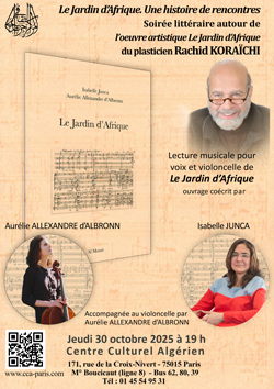 " Le Jardin d’Afrique. Une histoire de rencontres ". Soirée littéraire autour de l'œuvre artistique du plasticien Rachid KORAÏCHI - Jeudi 30 octobre 2025 à 19 h
